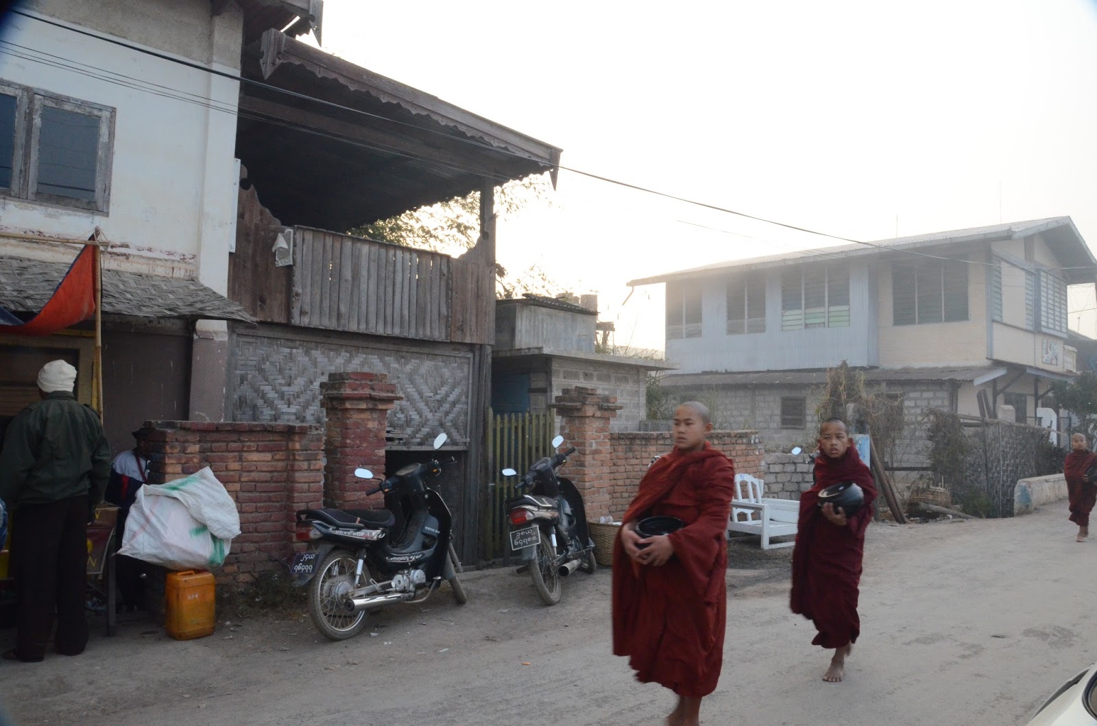 I was trying not to disturb, but this was the first time I had witnessed the morning alms, and I was too excited and think I must have distracted them a little.