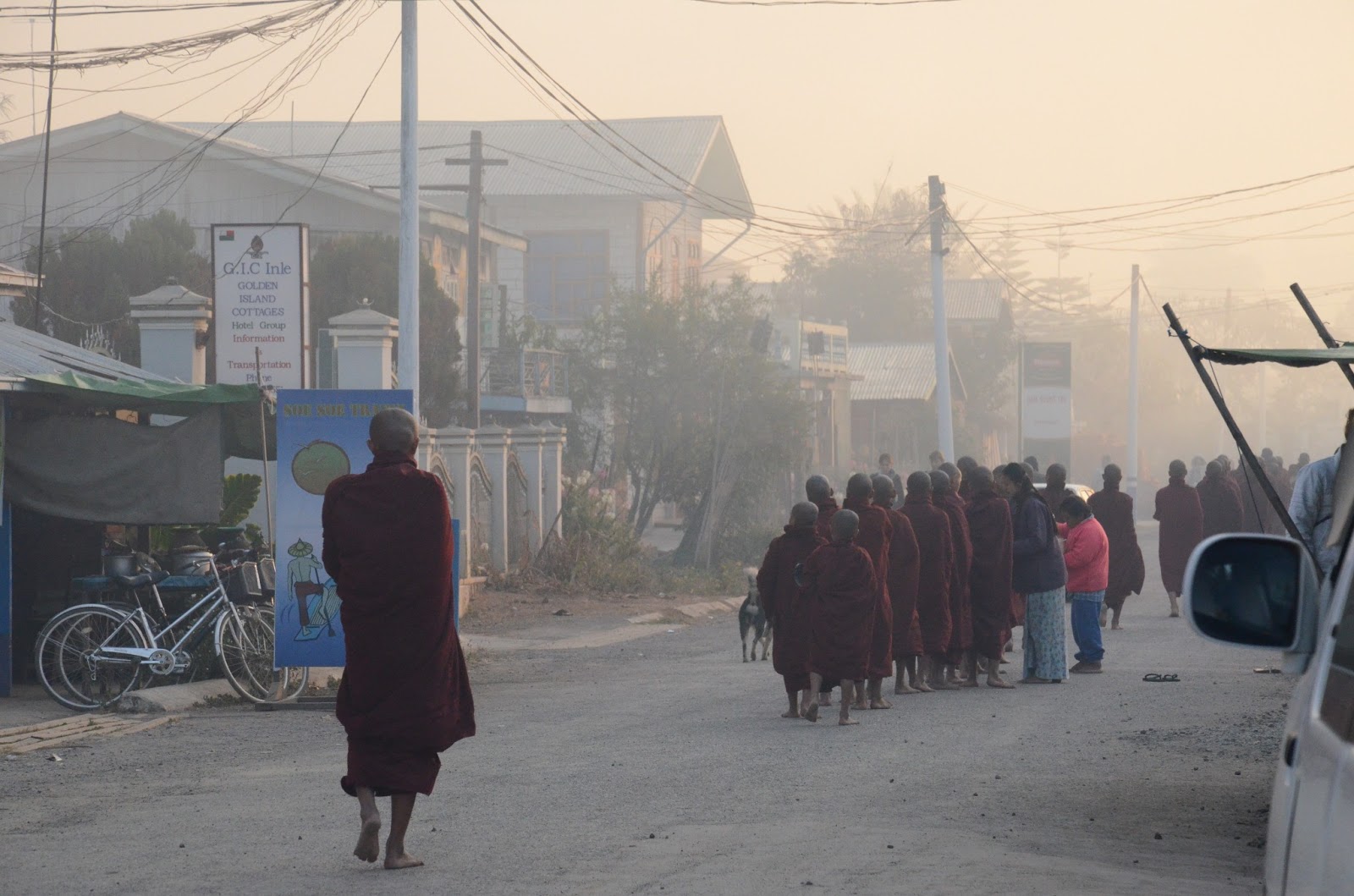 Myanmar is a country, where the tourism industry hasn’t taken over the religious side of life, at least not entirly yet. So, if you are keen to see it, get up early (around 6) and stand outside one of the temples, or monasteries. You can also ask the locals, where is the best place to go.