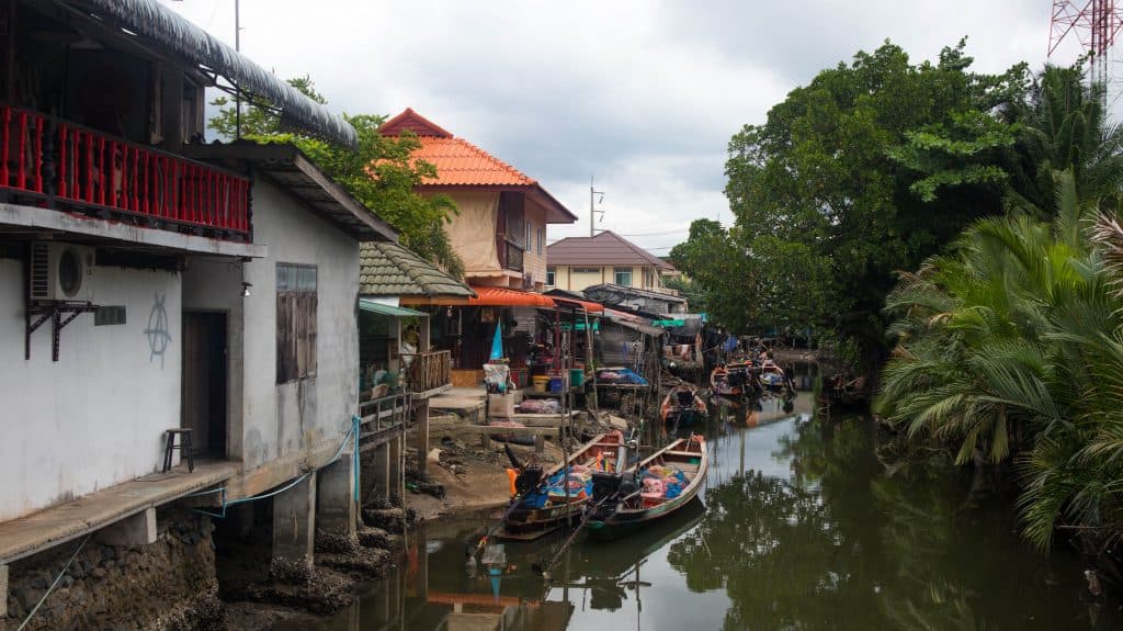Przy kanale ciągną się drewniane i murowane domy, gdzie mieszkają miejscowi rybacy, którzy ładują i rozładowują swoje łodzie przez cały dzień. Spacerowałam wśród tych domów, próbując nie zwracać na siebie uwgai, robiąc zdjęcia i obserwując ludzi. W niektórych miejscach całe rodziny pracowały przy sieciach, niektórzy sprzedawali ryby i owoce morza, a starszyzna siedziała na zewnątrz i przyglądała mi się z uwagą. Często witały mnie śmiechy i przyjazne ‘hello’, głównie od dzieci. Taka reakcja nie często zdarza mi się w Tajlandii. W większości miejsc ludzie albo nie zwracają uwagi na przyjezdnych, albo są nimi zmęczeni. Tutaj, podobnie jak w Chanthaburi, czy w Rayong, miejscowi byli mnie ciekawi i szczęśliwi, że widzą kogoś z zewnątrz.