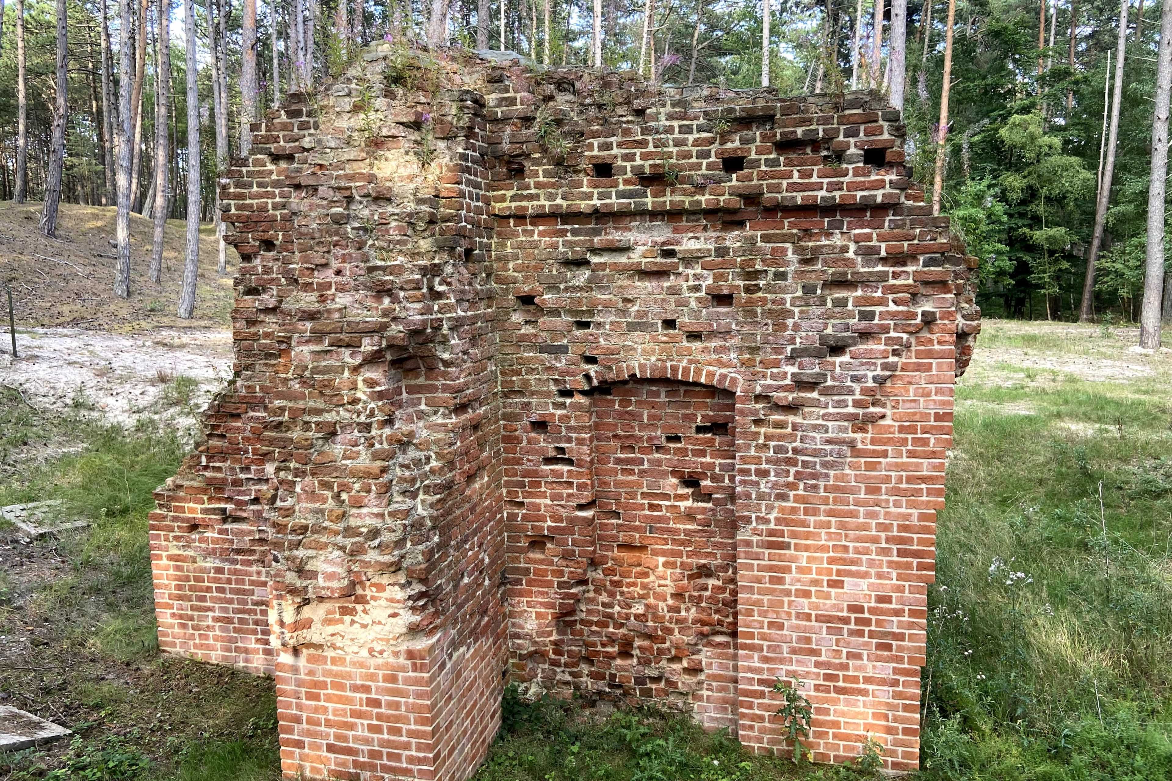 Droga prowadzi krótki kawałek przez las. Na końcu znajdują się pozostałości po ścianie kościoła.