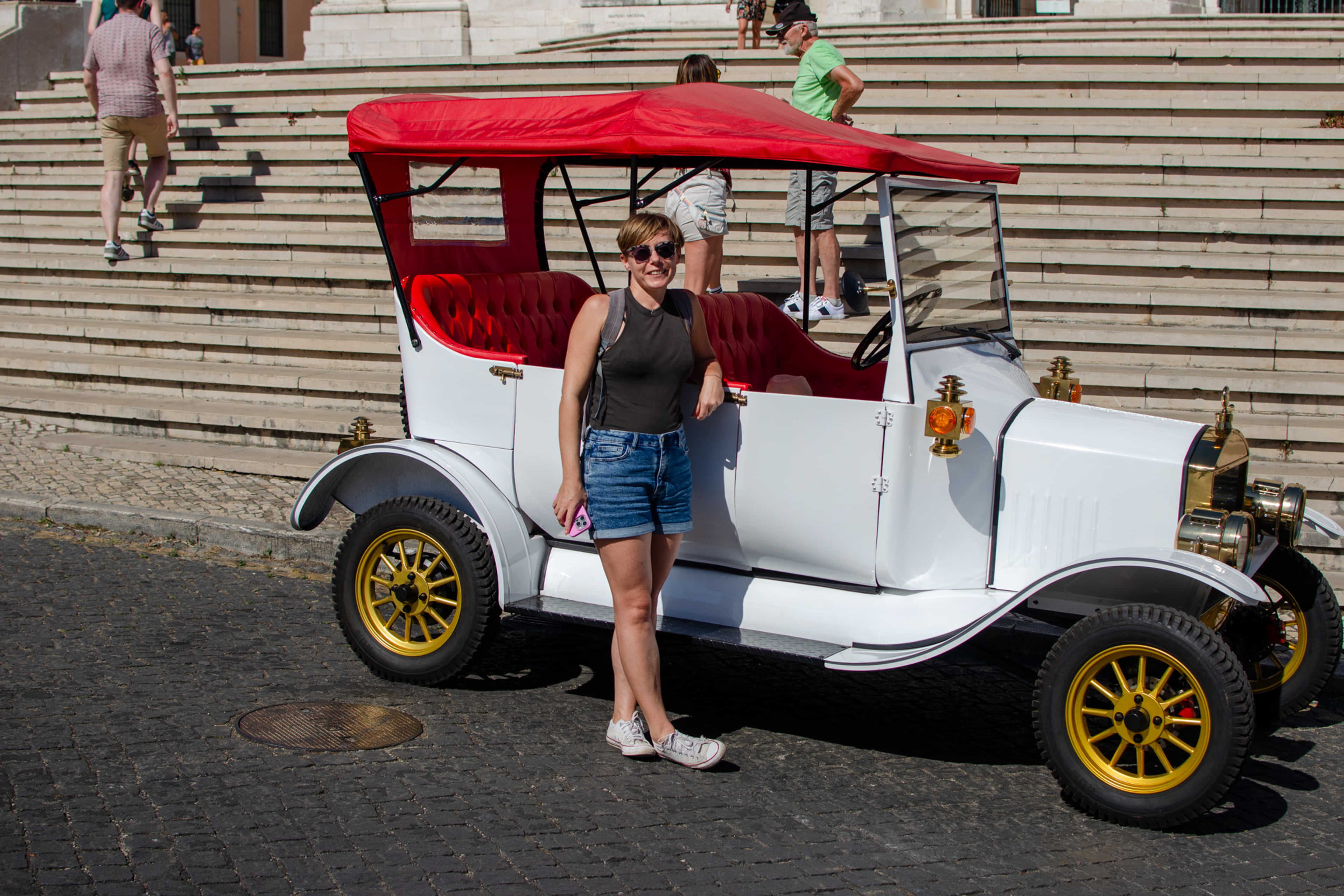 Tuk-tuk to specjalny pojazd, który najczęściej zobaczysz na ulicach Azji. Z tyłu posiada 3 miejsca siedzące i z przodu 2 lub 1 jedno miejsce. Dzięki swojej wielkości i zwrotności świetnie nadaje się na wycieczki po takich ulicach, jakie mamy w Lizbonie. Zmieści się w wiele miejsc, wjedzie w wąskie zakamarki i podjedzie pod niemal każdą górkę.